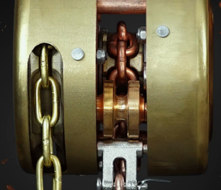 還有一部分零部件使用的是H62黃銅,這些零部件包括左右墻板、手拉鏈條、擋板、罩殼。其余的起重鏈條、四齒軸成套、支桿部件使用的是鋼質鍍銅材料。